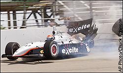 Former Indianapolis 500 winner Eddie Cheever hits the turn 2 wall during practice at the Indianapolis Motor Speedway.