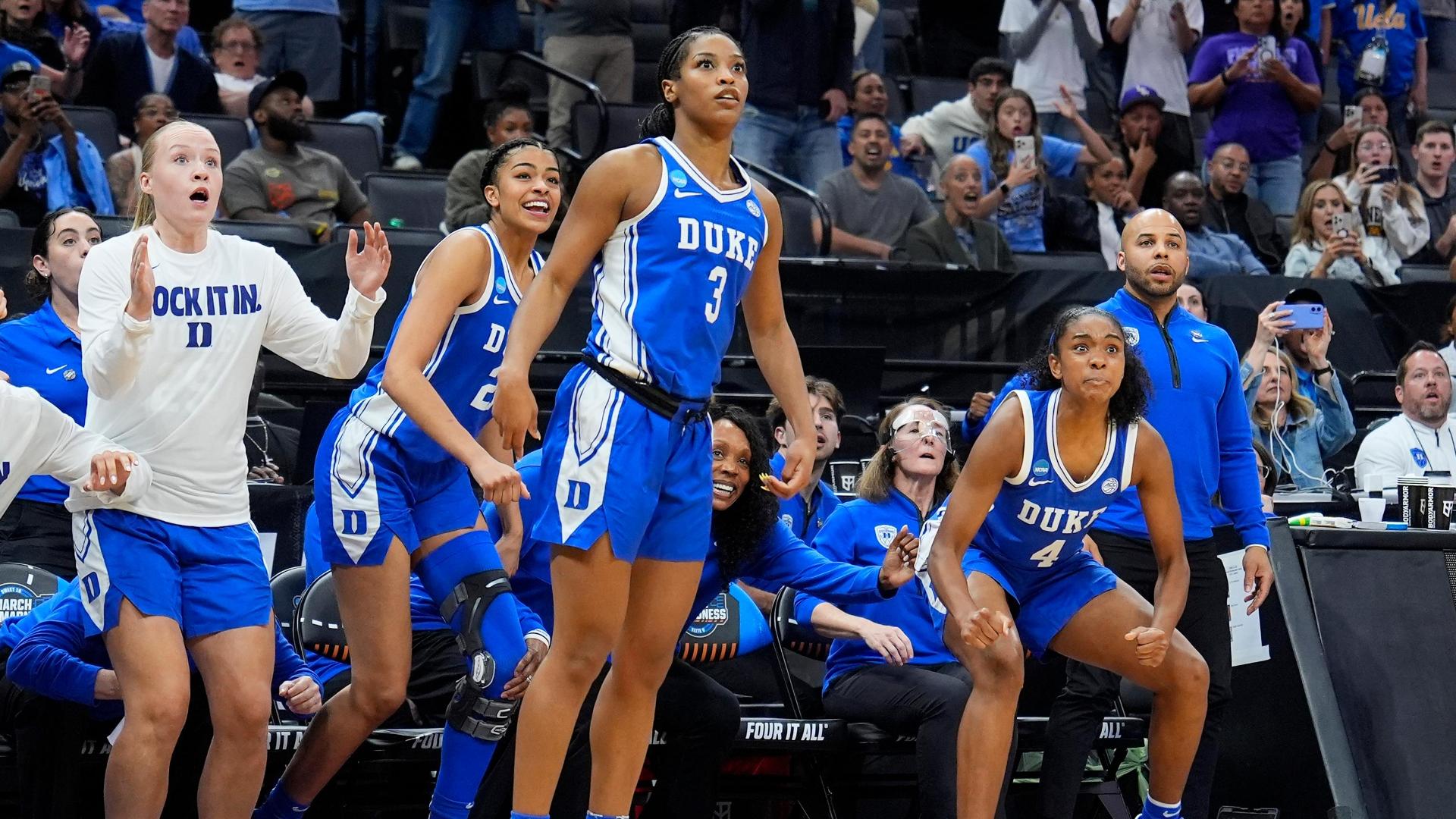 Ashlon Jackson fires a shot at the buzzer that goes down as Duke stuns LSU to move on to the Elite Eight.