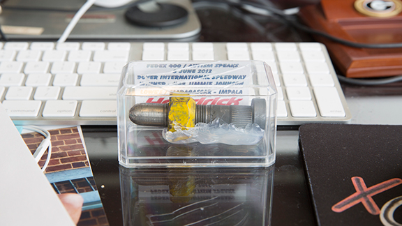 Near the top of Richt's computer keyboard is a small, clear box that includes a bolt. It's a piece of NASCAR driver Jimmie Johnson's winning car from the June 1 FedEx 400 benefiting Autism Speaks at Dover Speedway in Dover, Delaware.