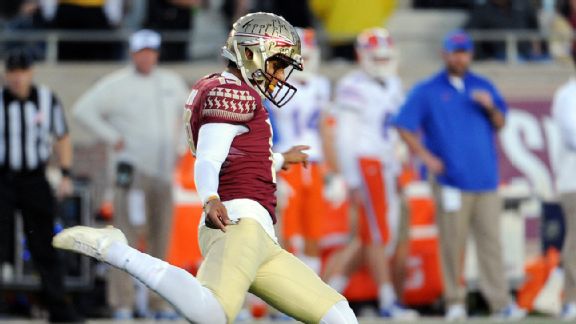 Place-kicker | Florida StateIt was news this season when Aguayo actually missed a field goal, which snapped a school-record 23 consecutive makes. Aguayo would miss once more but rallied for a strong sophomore campaign. His 92.6 percent conversion rate on field goals (25-of-27) ranks third nationally, and he was perfect from long distance, hitting all three attempts from 50-plus yards. In tense moments late in the season, Aguayo drilled the pressure kicks, too. As a redshirt freshman, nearly all of his field goals came in blowouts, but in 2014, he booted the game-winner in the rain to beat Boston College and scored all nine of Florida State's second-half points in the ACC championship game.