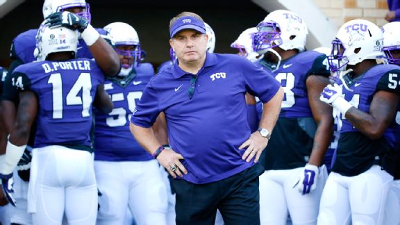 Head coach | TCUHe said it would take three to five years. He wasn't lying. Patterson guided TCU to a Big 12 co-championship in his third year in the conference, winning 11 games with the same cast of players that went 4-8 a year ago. He did so by finding the perfect offensive coordinators (Doug Meacham and Sonny Cumbie) to install an Air Raid and turn Trevone Boykin into the Big 12's best QB. Under Patterson's leadership, the Frogs survived a brutal stretch of five ranked foes in six weeks and came oh-so-close to a College Football Playoff bid. In his 14 years as head coach, TCU has now won titles in three different conferences. -- Max Olson