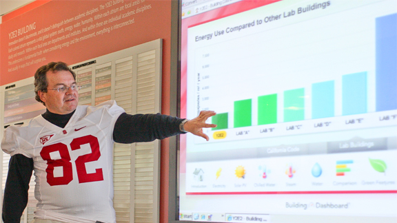 Director of Woods Institute for the Environment, Jeff Koseff, explaining Y2E2's sustainability performance to ESPN Eco-Challenge staff touring Y2E2 at Stanford. The 166,500-square-foot building uses 38 percent less energy than a traditional building of comparable size and 90 percent less total water than one with traditional fixtures and systems.