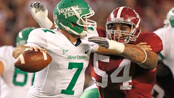 Defensive tackle | AlabamaWith his war paint on, tattoos in full view and a mohawk rolling down the back of his neck, Jesse Williams plays the part of the beast well. The Australian-born transfer was a raw talent in 2011. With a full season under his belt, Williams is poised for a breakout in 2012. The 320-pound lineman made waves this summer by bench pressing 600 pounds. Teammates say that wasn't his max and were quick to point out that his strength isn't his only asset. He's athletic, too. Nose guards at Alabama are usually space-eaters who terrorize interior linemen, but Williams wants to change that. He wants to scare quarterbacks, too.