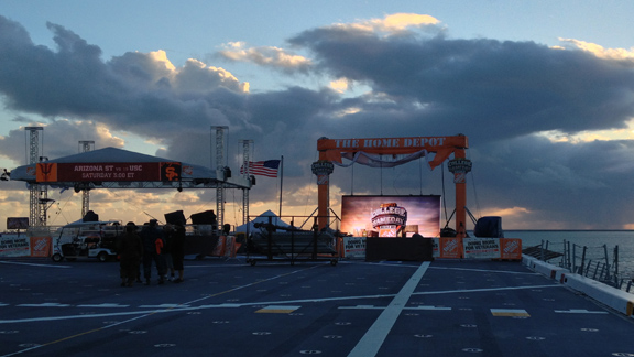 Navy 1: ESPN College Gameday broadcasted from the USS San Diego for Veteran's Day 2012. The ESPN Green Team visited the Naval Base San Diego- NBSD Recycling Center for a tour. They have full scale sustainable solid waste program which services all 3 bases in San Diego, around 35,000 people. The program profits approximately 4 million dollars a year, being the Navy's only self-sustaining program. The money is applied to employee salaries, center operations, research toward environmental improvements on base, and the remaining goes to the Naval MWR fund for soldier moral welfare and recreation.