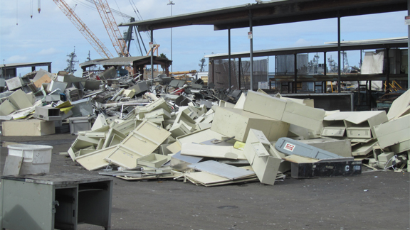 Navy 5: Old lockers and furniture from one of the Naval Ships in the NBSD Recycling Center reclamation yard. Once the useable items are sorted and sent to the surplus store, the remaining items are scrapped and recycled. There are strict regulations on Construction and Demolition disposal in the city of San Diego. Therefore, many items are required to be recycled. The Department of Defense requirement for the NBSD's waste diversion is 42%; this facility is around 72% diversion from the landfill. They are looking to increase this number through a compost study, the feasibility of thermal condition or anaerobic digestion at NBSD, for the 100-150 tons/day of organic waste from the 3 bases.