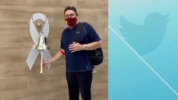 Washington coach Ron Rivera receives an ovation as he walks down the hospital hallway to ring the bell after his final day of cancer treatment.