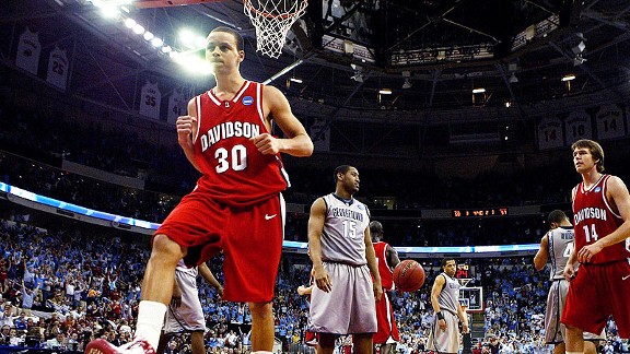 The super-scoring son of former NBA standout Dell Curry led the 10th-seed Wildcats to upset after upset in the 2008 NCAA tournament -- scoring 40 against Gonzaga, 30 against Georgetown, and 33 against Wisconsin en route to the Elite Eight. There, the sophomore scored 25 in a two-point loss to eventual NCAA champion Kansas, and Davidson fans may always wonder what might have happened if Curry could have escaped a Jayhawks double-team at the end of the game, and been able to hoist the last shot instead of passing to a teammate. In 2009, he became the seventh overall pick in the NBA draft. -- Robbi Pickeral