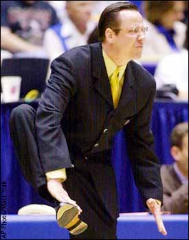 Winthrop head coach Gregg Marshall shows the referee that an Oklahoma player kicked the ball during the second half in the NCAA West Regionals. Oklahoma defeated Winthrop 74-50.