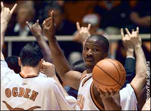 Texas forward Gabe Muoneke turns around as the team celebrates its 77-61 win over Indiana State in the first round of the NCAA West Regional. ![]() ![]() ![]() |