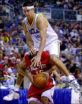 UCLA's Jason Kapono fouls Ball State's Duane Clemens as he lands on him during the first round of the men's NCAA basketball tournament. UCLA won 65-57. ![]() ![]() ![]() |