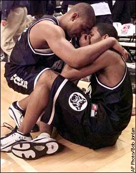 Butler's Mike Marshall comforts teammate LaVall Jordan after the Bulldogs' last-second 69-68 overtime loss to Florida. Jordan missed two free-throw attempts with 8.1 seconds left in the game.