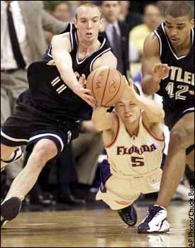 Butler's Andrew Graves fights for a loose ball with Florida's Teddy Dupay as Butler's Rylan Hanjie moves in during the second half of their NCAA tournament first-round game. Florida won 69-68 in overtime.