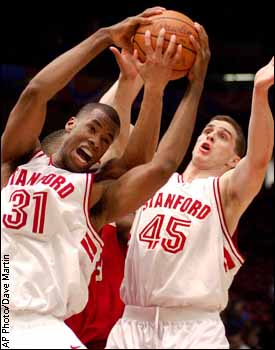 Stanford's Jarron Collins and Mark Madsen battle for a rebound against South Carolina State's James Jones, partially obscured, in their first-round game. Stanford won 84-65. ![]() ![]() ![]() |