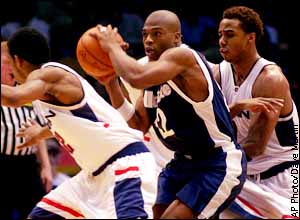 Utah State's Troy Rolle tries to work through the defense of Connecticut's Tony Robinson and Kevin Freeman during their first-round game. UConn won 75-67. ![]() ![]() ![]() |