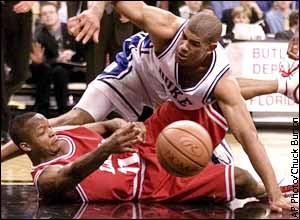 Duke's Shane Battier dives over Lamar's Thaydeus Holden as they battle for a loose ball during their first-round matchup. Duke defeated Lamar 82-55. ![]() ![]() ![]() |