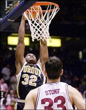 Purdue center Greg McQuay dunks as Oklahoma's Renzi Stone watches during the Boilermakers' upset of the number three seed Sooners. ![]() ![]() ![]() |