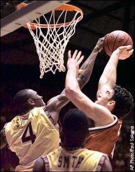 Louisiana State's Stromile Swift rejects a scoring attempt by Texas' Chris Mihm in the final moments in LSU's 72-67 win in the second round of the NCAA West Regionals in Salt Lake City.