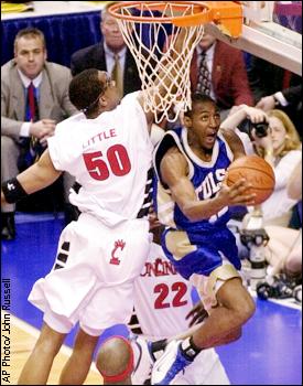 Tulsa's Dante Swanson goes to the basket between Cincinnati defenders Donald Little and Steve Logan in the first half. Tulsa defeated the Bearcats 69-61 in the second round of the NCAA South Regional.
