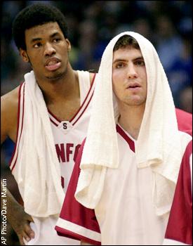 Stanford's Jason Collins, left, and Alex Gelbard watch the final moments of the game against North Carolina as Stanford lost to North Carolina 60-53 in the second round in the NCAA South Regional.