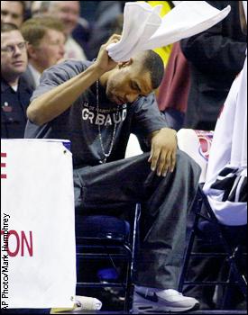 Injured Cincinnati star Kenyon Martin slams a towel to the floor as he watches his team battle Tulsa in the second round of the NCAA South Regional. Cincinnati lost the game 69-61.