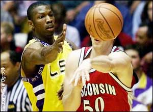 Wisconsin forward Mark Vershaw passes the ball under pressure from LSU forward Stromile Swift during first half action at the West Regional semifinals. Wisconsin defeated LSU 61-48 to advance to the finals.