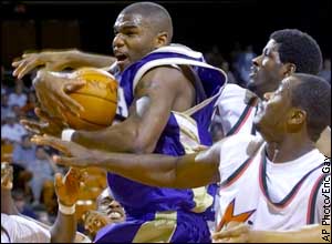 Tulsa's Tony Heard pulls down a rebound in front of Miami's Johnny Hemsley, front, and Dwayne Wimbley during the first half of the NCAA South Regional semifinal game. ![]() ![]() ![]() |