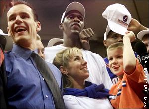 Florida's head coach Billy Donovan, left, celebrates with his wife Christine and son Billy Jr., and player Brent Wright after defeating Oklahoma State 77-65 in the NCAA East Regional Championship.