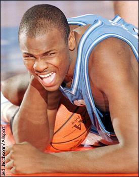 The agony of defeat Brendan Haywood of North Carolina grimaces in pain after falling to the floor during the semifinal round of the NCAA Final Four against Florida at the RCA Dome in Indianapolis. Florida won the game 71-59, advancing to the final game Monday against Michigan State.