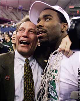 Michigan State head coach Tom Izzo, left, and Mateen Cleaves embrace as they celebrate their 89-76 win over Florida to win the NCAA Championship game. ![]() ![]() ![]() |