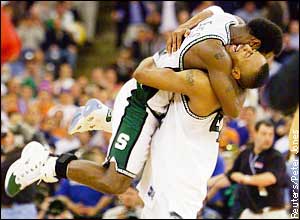 Michigan State Spartan Mateen Cleaves jumps into the arms of teammate Morris Peterson as they celebrate their NCAA men's basketball championship. Michigan State defeated Florida 89-76.
