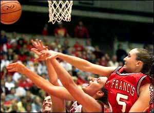 Iowa State's Angie Welle fights for a rebound with Saint Francis' Jen DeFilippo and Beth Barnabei during their first-round game. Iowa State defeat Saint Francis 92-63. ![]() ![]() ![]() |