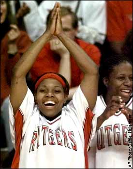 Rutgers guards Tasha Pointer and Karlita Washington celebrate towards the end of their first round NCAA tournament game against Holy Cross. Rutgers defeated Holy Cross 91-70. ![]() ![]() ![]() |