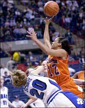 Clemson's Krystal Scott goes up over Drake's Stephanie Schmitz for a shot during their first-round game of NCAA tournament. Clemson won 64-50 to advance to the second round against Connecticut on Sunday.