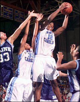 North Carolina's Jackie Higgins hauls in a rebound with help from LaQuanda Barksdale, center left, against Maine's Anna James in the first round of the West regional NCAA women's tournament.
