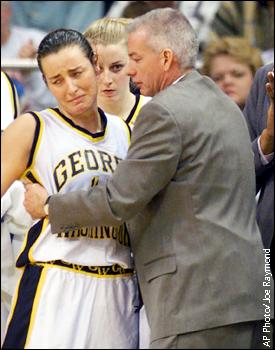 George Washington coach Joe McKeown consoles Elisa Aguilar as she leaves near the end of their 95-60 loss to Notre Dame. Looking from left are Petra Dubovcova and Marlo Egleston.