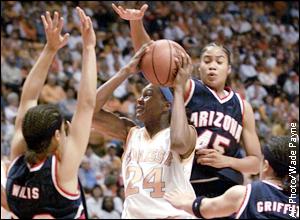 Tennessee's Tamika Catchings drives for the basket as she is surrounded by Arizona's Felecity Crank (23), Elizabeth Pickney (45) and Lisa Griffith (3) during their NCAA Mideast Region second-round game.