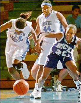 Rice guard Marla Brumfield, right, chases a loose ball with North Carolina's Coretta Brown (14) and Cherie Lea (44) in the first half of their NCAA West Regional second-round game.