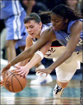 North Carolina's Nikki Teasley, right, dives to the floor in a battle for the ball with Georgia's Coco Miller. ![]() ![]() ![]() |