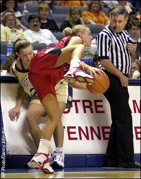 Thin line between victory and defeat. Texas Tech guard Melinda Schmucker-Pharies tries to stay in bounds as she is defended by Notre Dame's Alicia Ratay, left, in their semifinal round game at the NCAA Mideast Regional tournament in Memphis, Tenn. on Saturday, March 25, 2000. Texas Tech won, 69-65, to advance to the championship game against Tennessee on Monday.