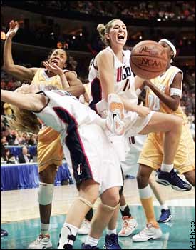 Put your left leg in ... Connecticut's Shea Ralph, left, and Kelly Schumacher, center, go for a loose ball against Tennesee's Michelle Snow, right, and Kyra Elzy during the first half of the Women's Final Four Championship at the First Union Center in Philadelphia on Sunday.